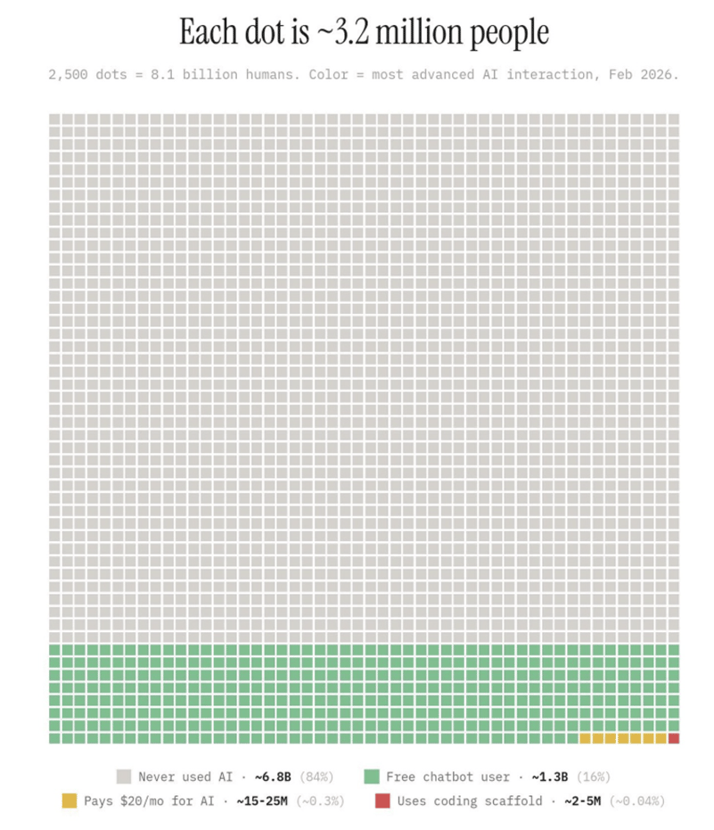 O primeiro mostra o tamanho real da adoção global. Cada ponto representa cerca de 3,2 milhões de pessoas. No total, 8,1 bilhões de seres humanos. O que salta aos olhos é o cinza: cerca de 84% da população mundial nunca usou uma ferramenta de IA.