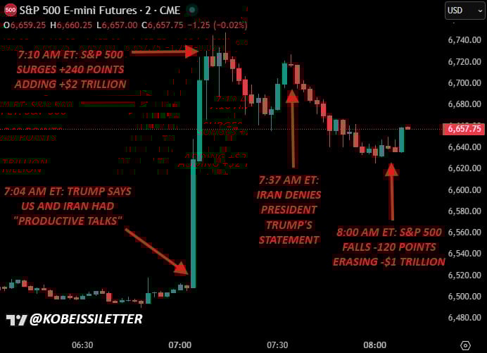 Isso representa uma oscilação de US$ 3 trilhões no valor de mercado em 56 minutos, apenas no S&P 500. @KobeissiLetter